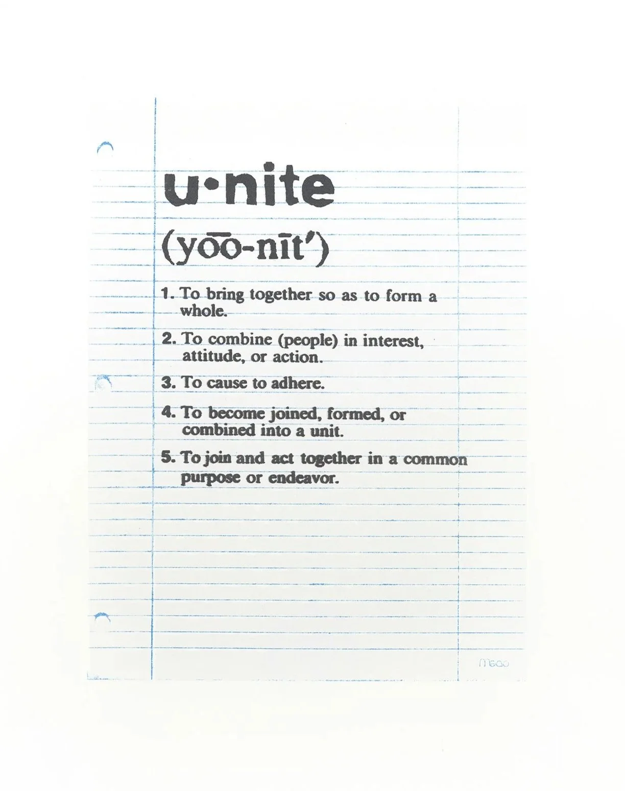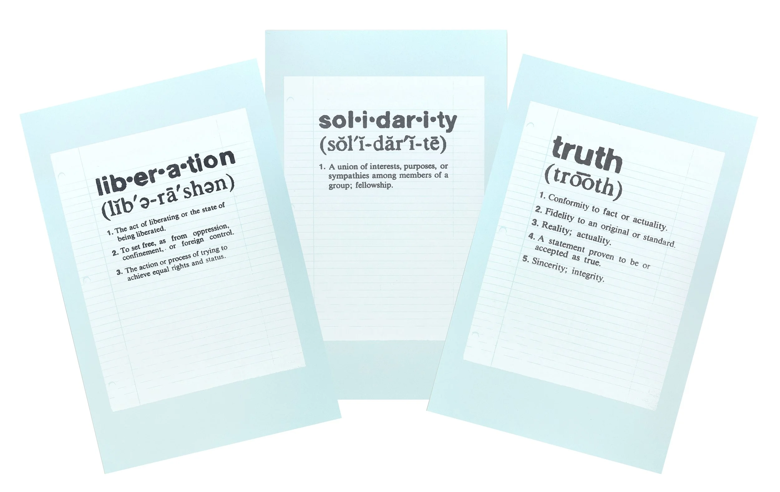 Each definition was printed on 46 old (circa 2009!) enlarged ‘notebook paper’ screen prints (15’’ x 19’’ total size) - unearthed when moving studio spaces. This series was really born out of wanting to use these old prints - landing on notes (definitions) for the current times.