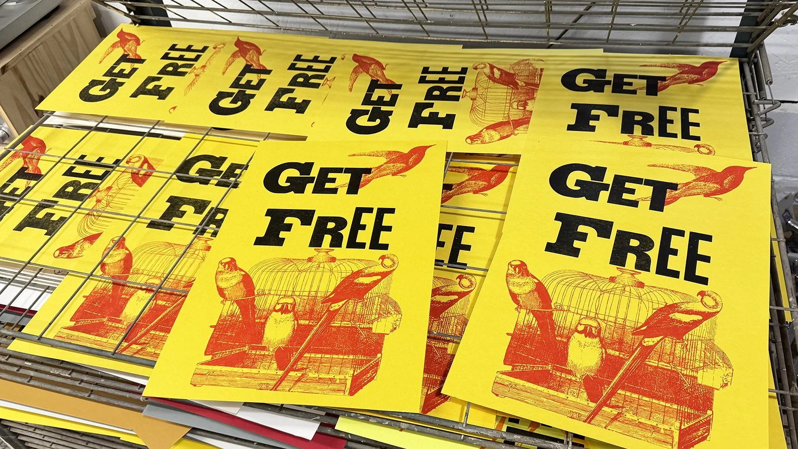 Printed in multiple variations using teal, light lime, sunflower, scarlet, yellow, bright gold, and mahogany riso inks.