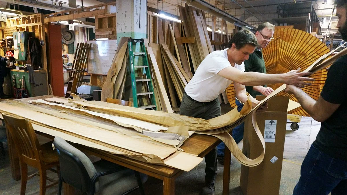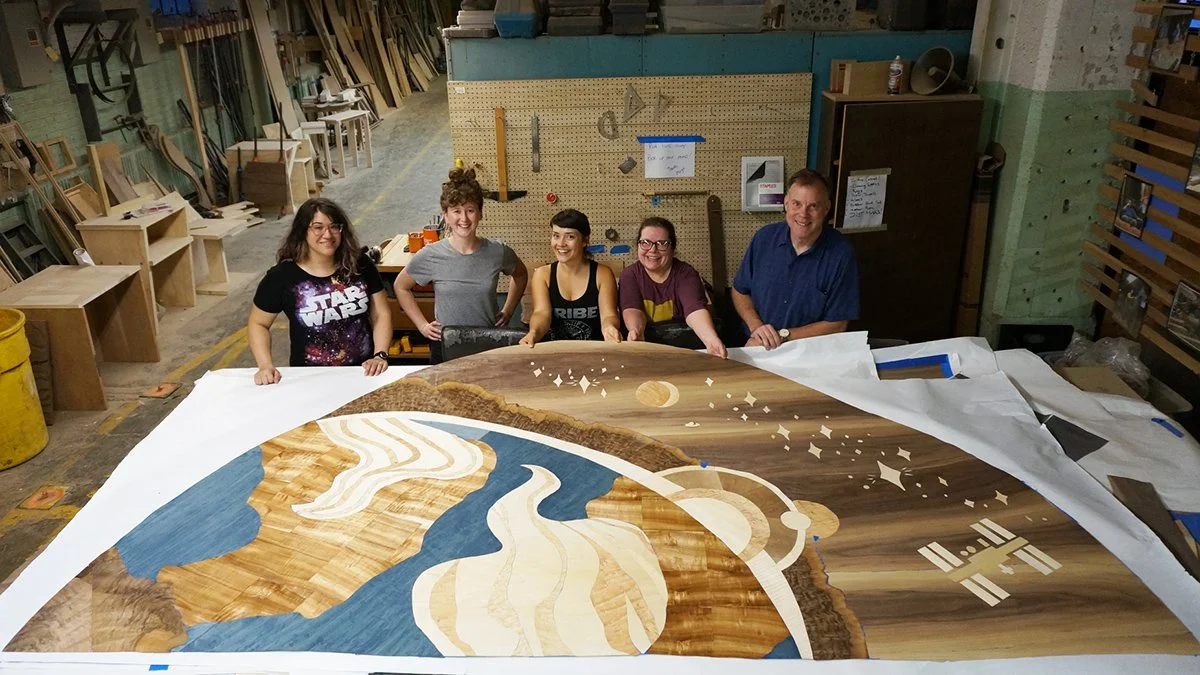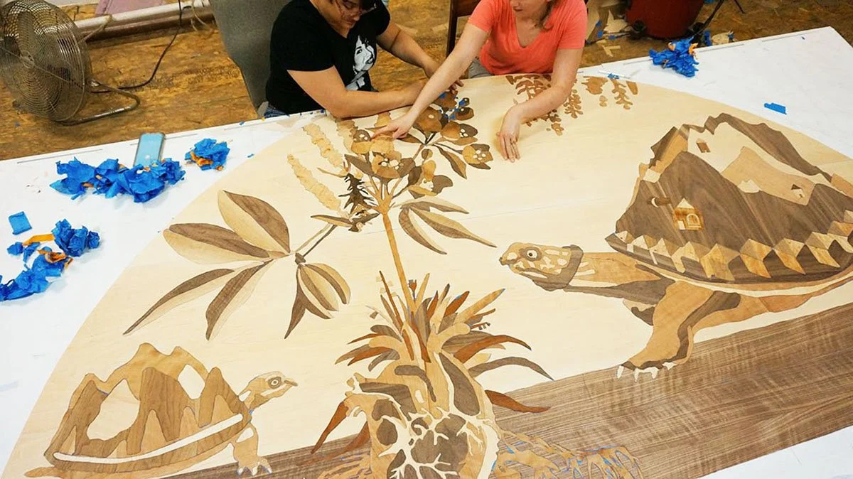 Artwork for the panels is made using the marquetry technique , where imagery is created from thin wood veneer (walnut, cherry, and maple). All content centers around the theme of ‘home’. Over 100 participants were involved in the creation of these panels.